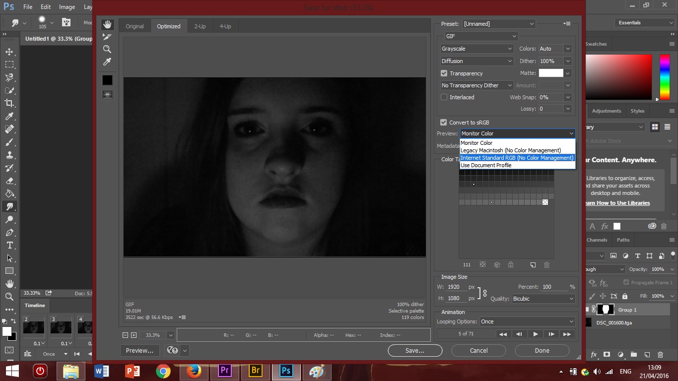 This then brings up a menu which I've already set preferences for. Because gifs can only be a certain amount of frames to work properly, you have to toggle a few things. I changed a few of my settings and made sure I converted it to 'Internet Standard RGB' which just makes sure it runs properly when used online.